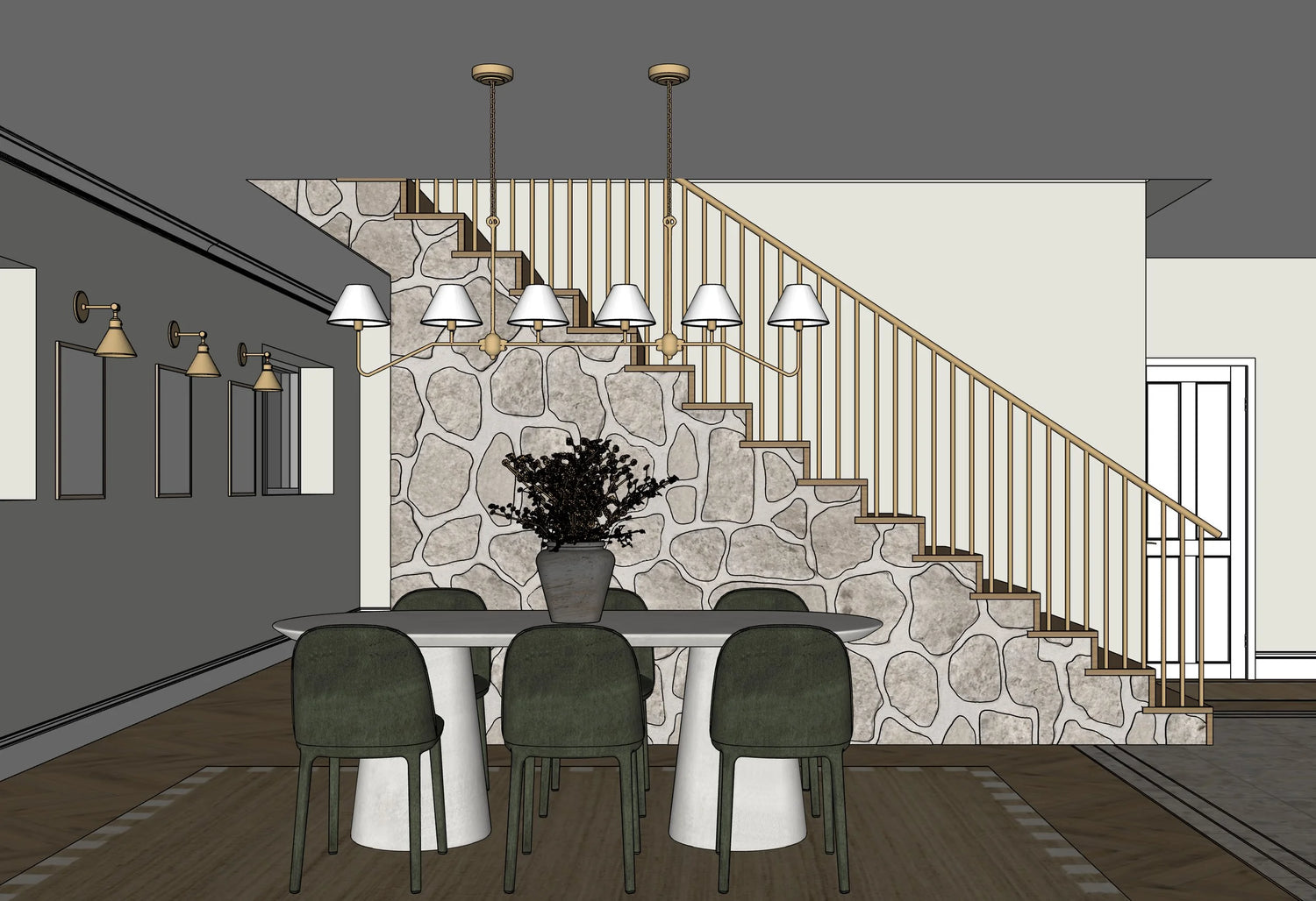 The generously sized island—crafted in matching oak—anchors the room as both a functional workspace and a natural gathering point for everyday moments. Soft brass accents, layered lighting, and a palette drawn from nature lend warmth and quiet elegance throughout. The result is a kitchen that feels inviting, timeless, and effortlessly livable—rooted in tradition, yet perfectly suited to modern life.