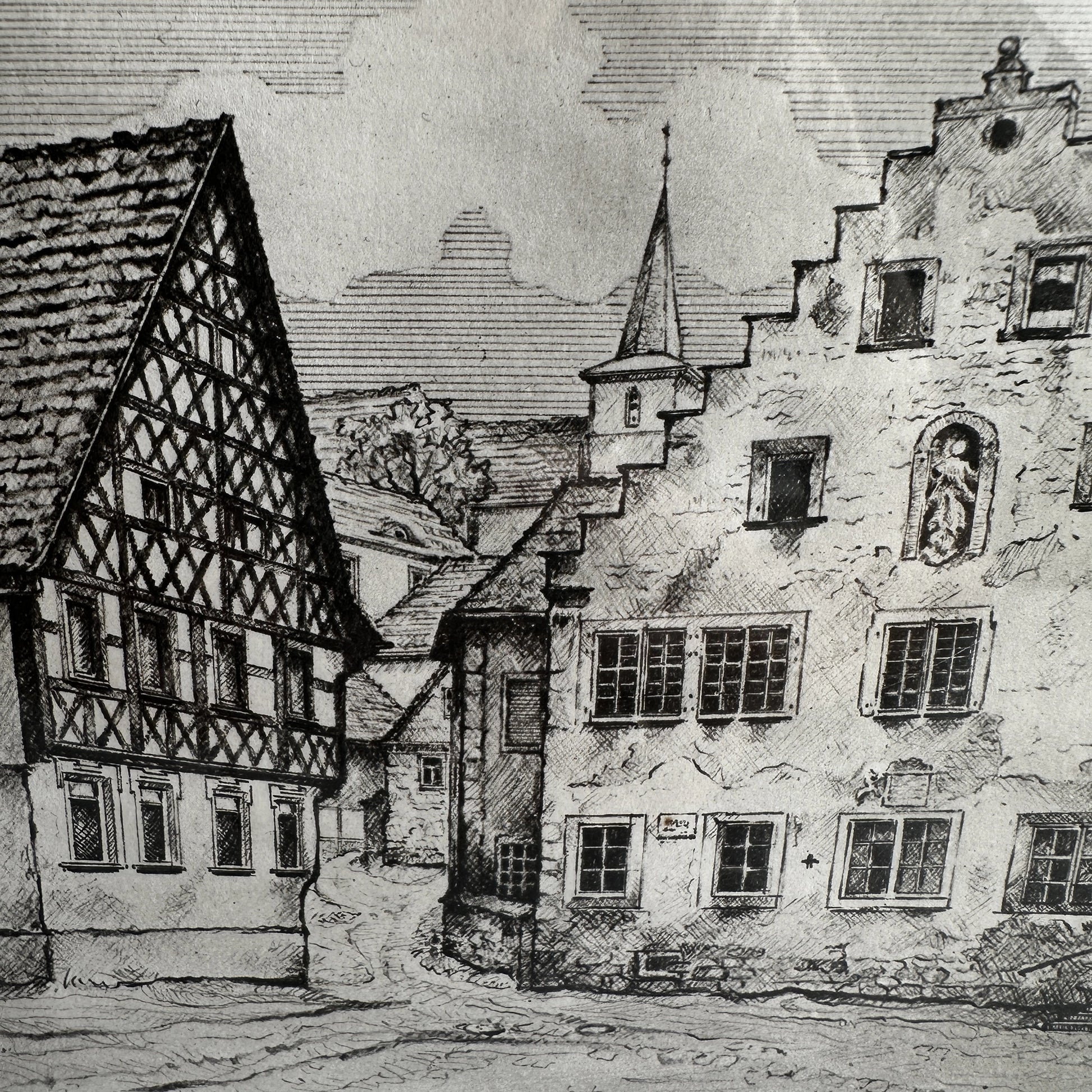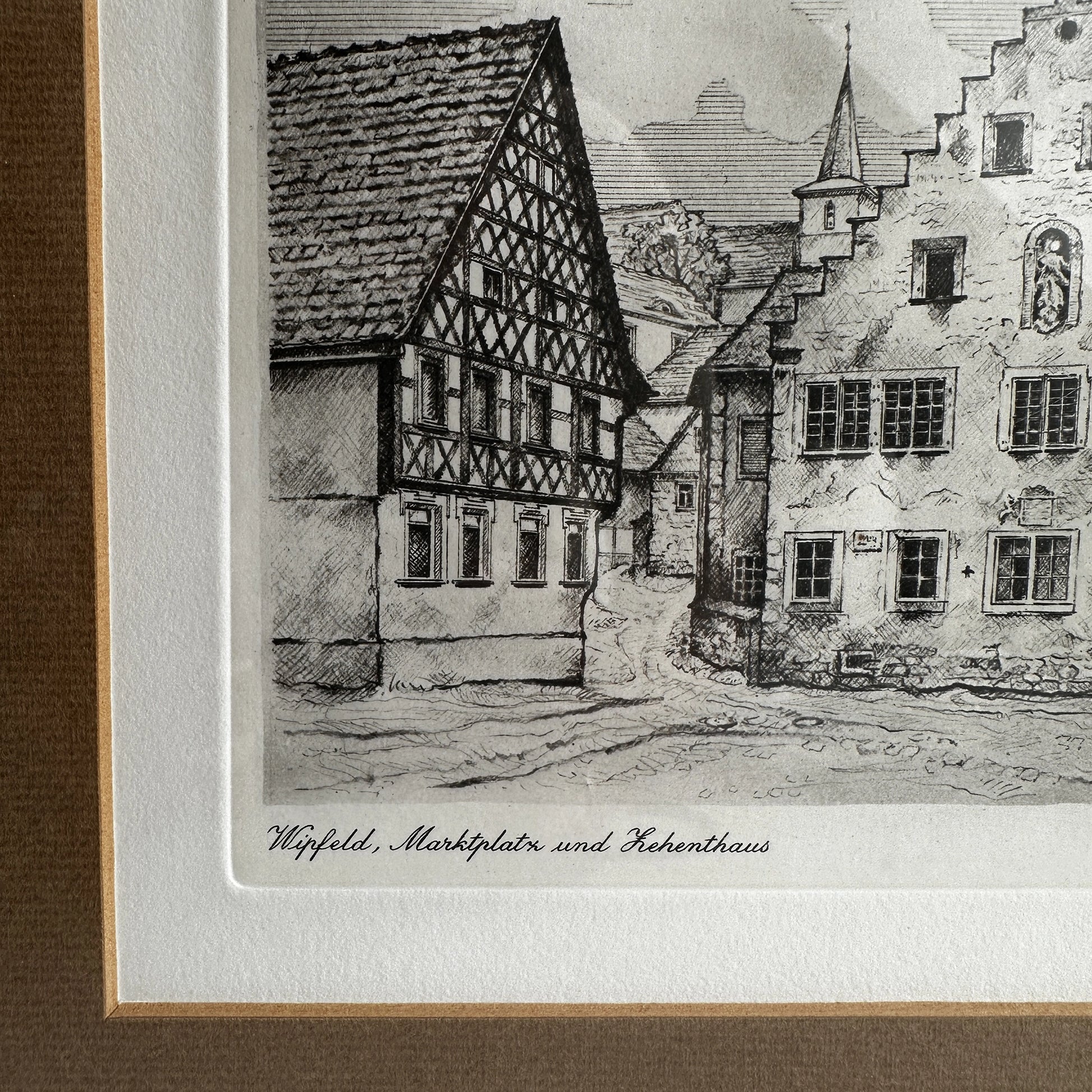 This one-of-a-kind original Historic Print features a detailed etching of historic Wipfeld, Germany, created using traditional etching techniques. With its precise linework and architectural charm, this piece beautifully captures a timeless European streetscape.
