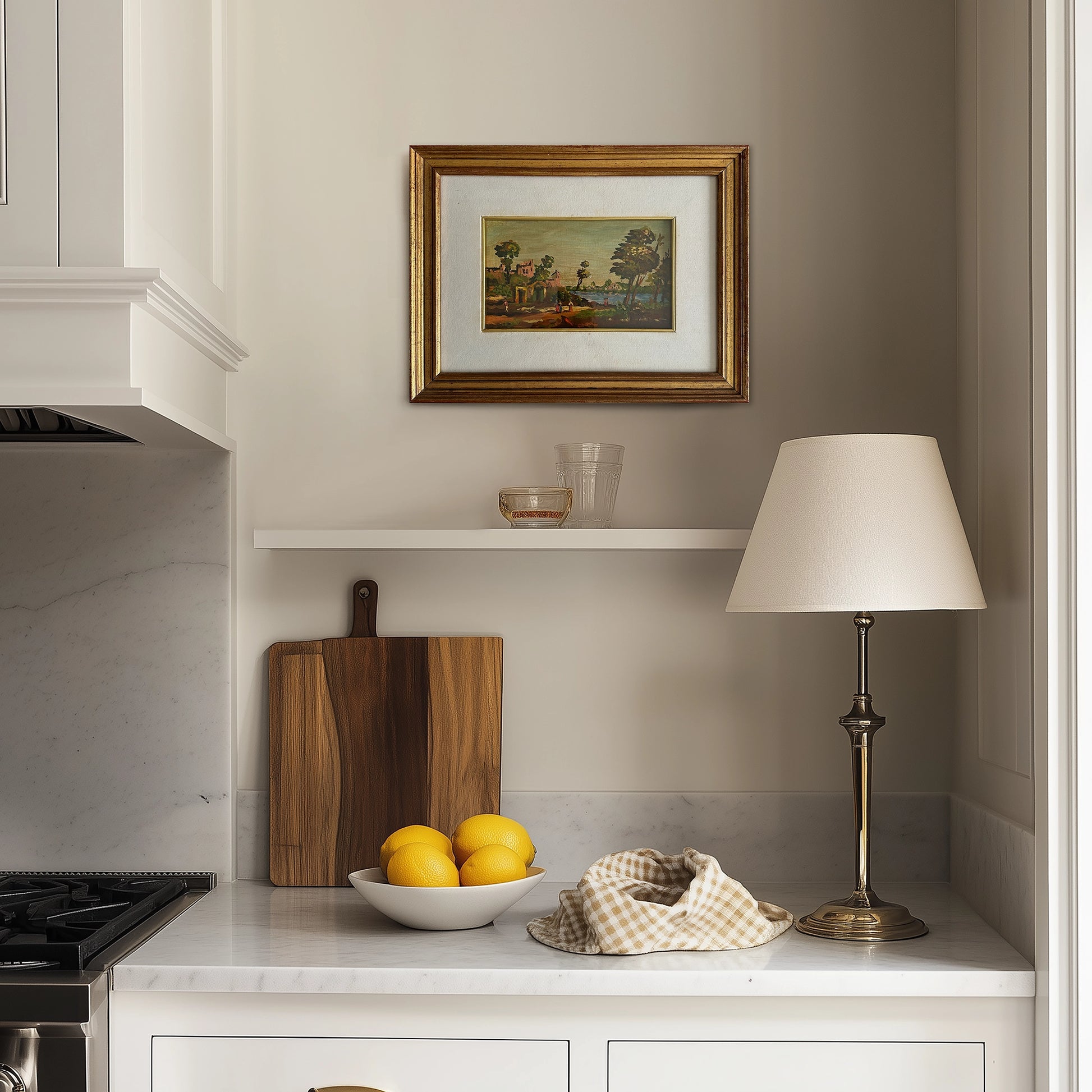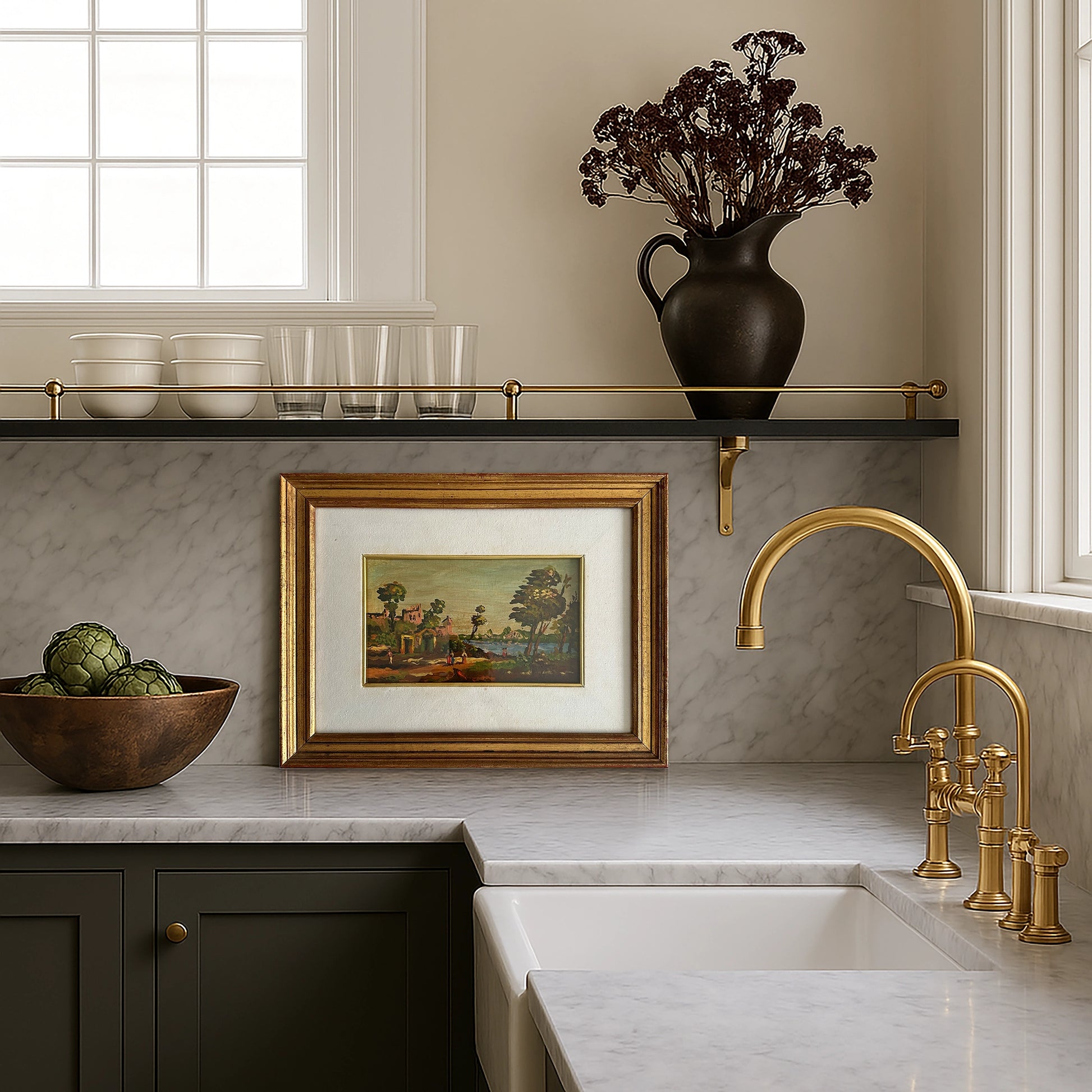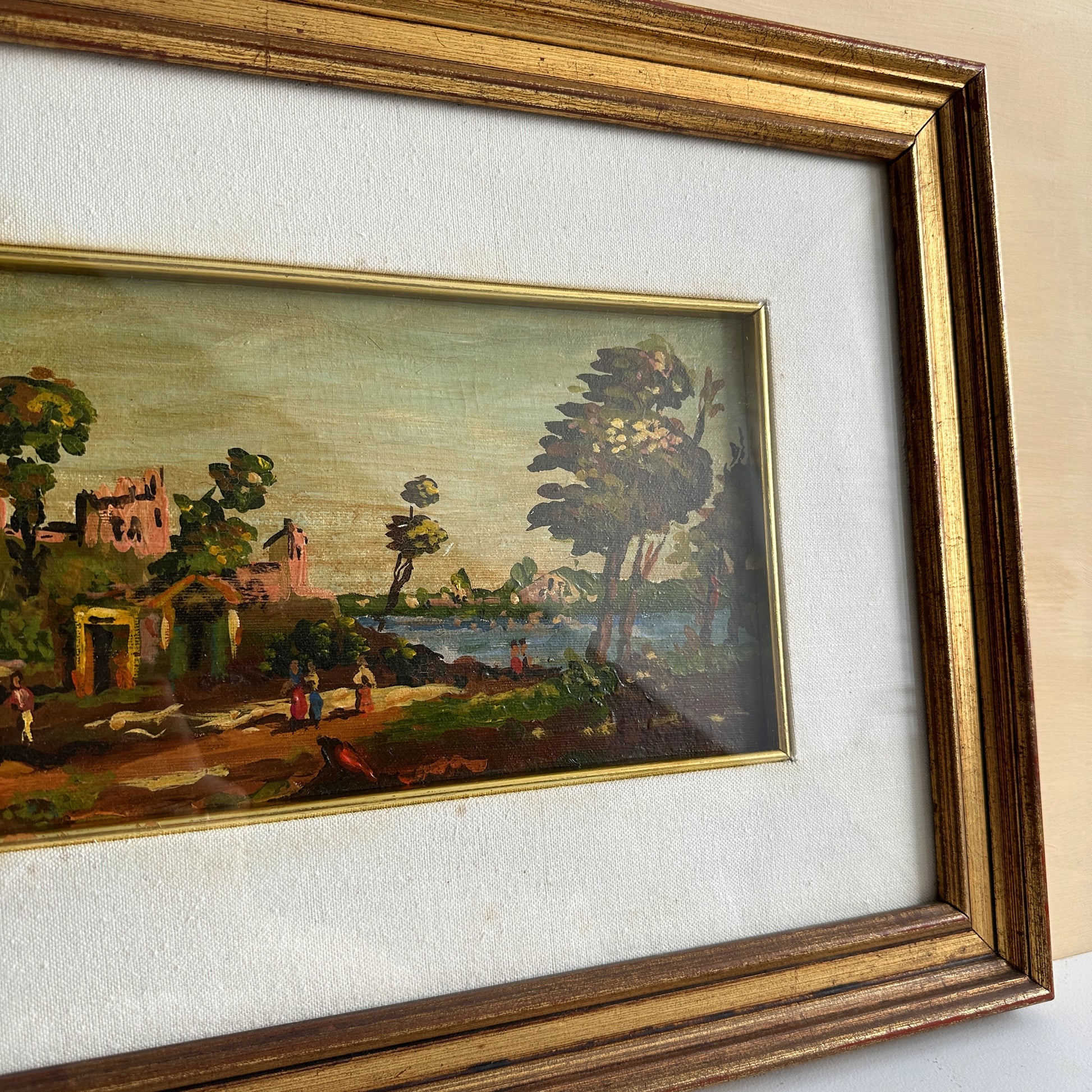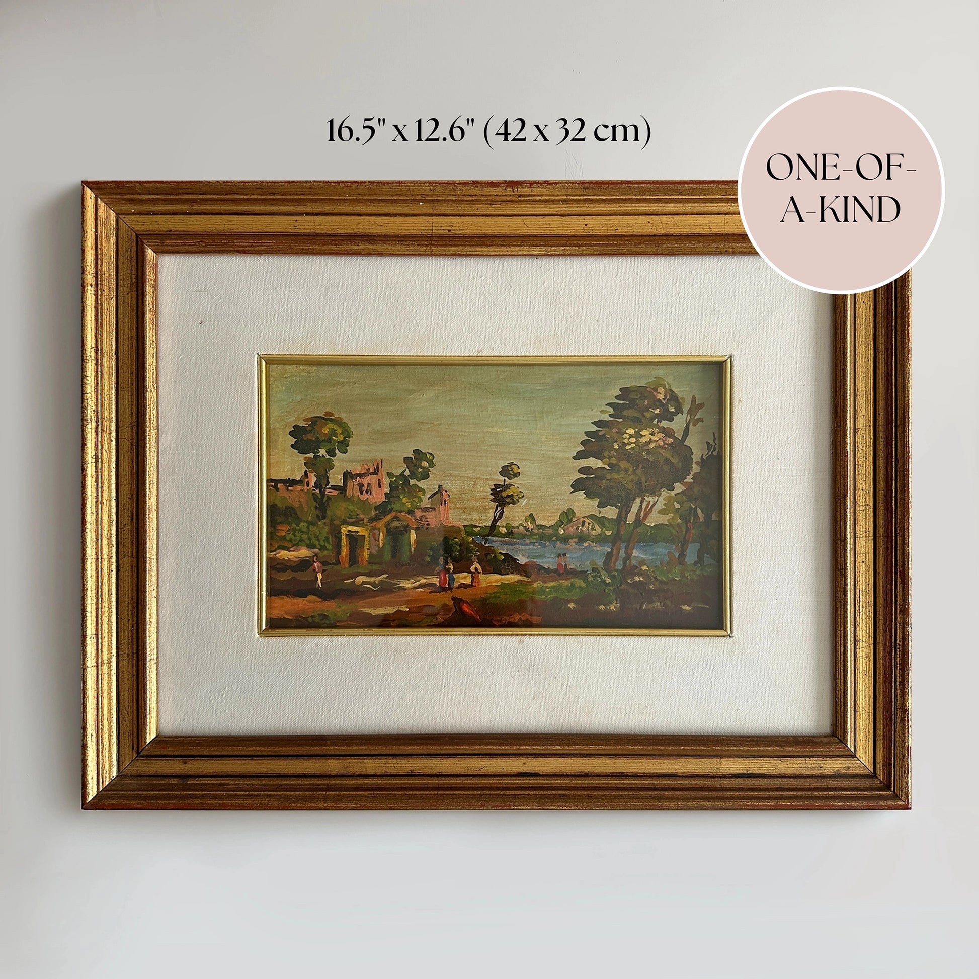 This captivating French oil painting from the 1940s portrays a romantic countryside landscape, complete with figures, rustic buildings, and lush trees near a calm body of water. The expressive brushstrokes and rich, earthy tones evoke timeless charm and pastoral beauty. Elegantly set in a substantial vintage wooden frame with gold accents, this one-of-a-kind piece carries the warmth of history and the allure of old-world artistry.