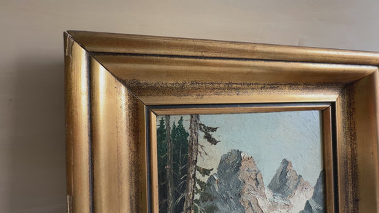 Dated 1952 and painted in Germany, this original oil on hardboard features expressive brushwork and a rich, earthy palette. Beautifully preserved in its original golden wooden frame, this one-of-a-kind piece offers a timeless window into the beauty of the European Alps—perfect for adding vintage charm and natural serenity to any interior.