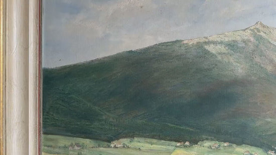 Step into the serene charm of rural Germany with this original 1962 oil painting by artist Glock. Depicting a sprawling green valley beneath a softly lit mountain peak, this one-of-a-kind piece captures the peaceful rhythm of village life with remarkable detail and depth.