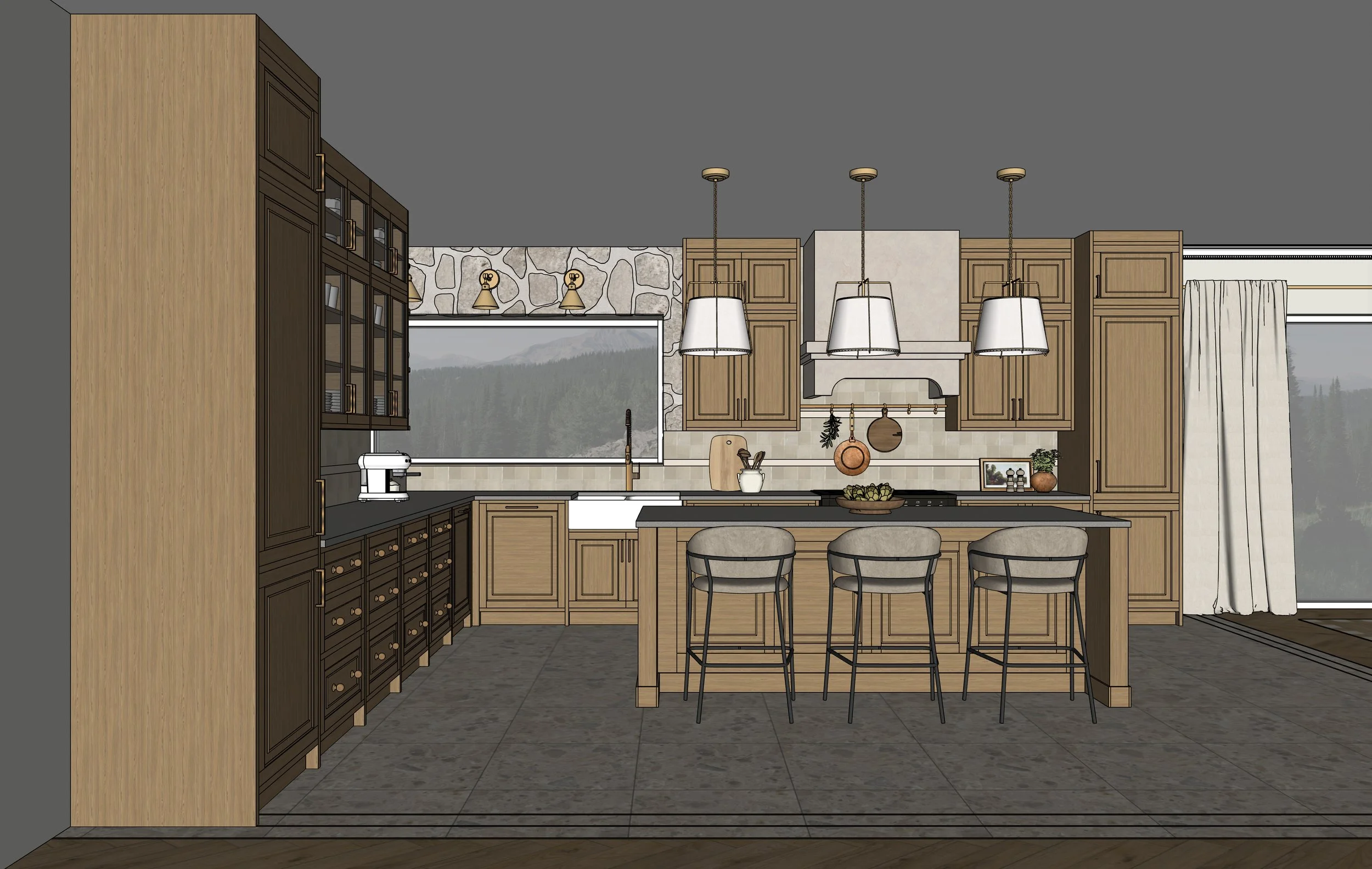 Step into Raisa's Rustic Contemporary Kitchen, where timeless charm meets modern-day comfort. This beautifully crafted space blends the warmth of natural wood cabinetry with the clean lines of contemporary design. Rich oak textures, glass-fronted displays, and handcrafted details create a sense of tradition, while sleek countertops, integrated appliances, and tailored lighting add a modern edge. The central island—crafted from the same oak as the surrounding cabinets—serves as a functional focal point, perfect for gathering, prepping, or simply enjoying a slow morning. With subtle brass accents, glass-fronted details, and a palette inspired by nature, Raisa’s kitchen is a serene retreat where rustic charm and contemporary design live in perfect balance.